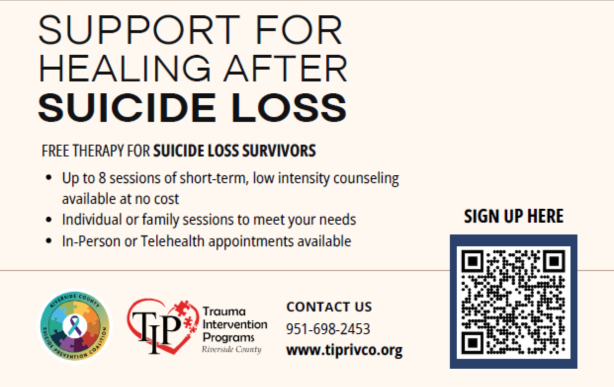 The Riverside County Suicide Prevention Coalition and Trauma Intervention Program (TIP) are proud to announce that Brief Bereavement Counseling for Survivors of Suicide Loss is now available.